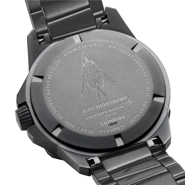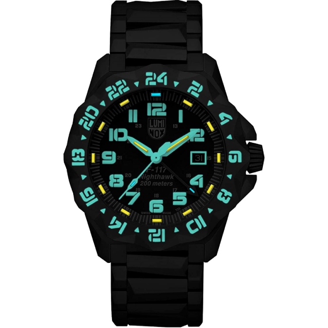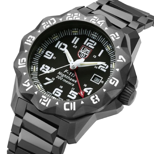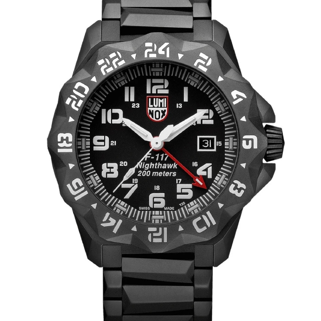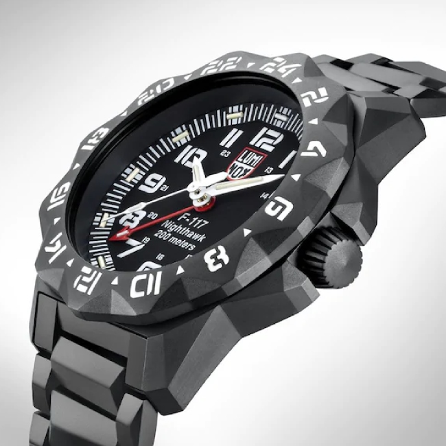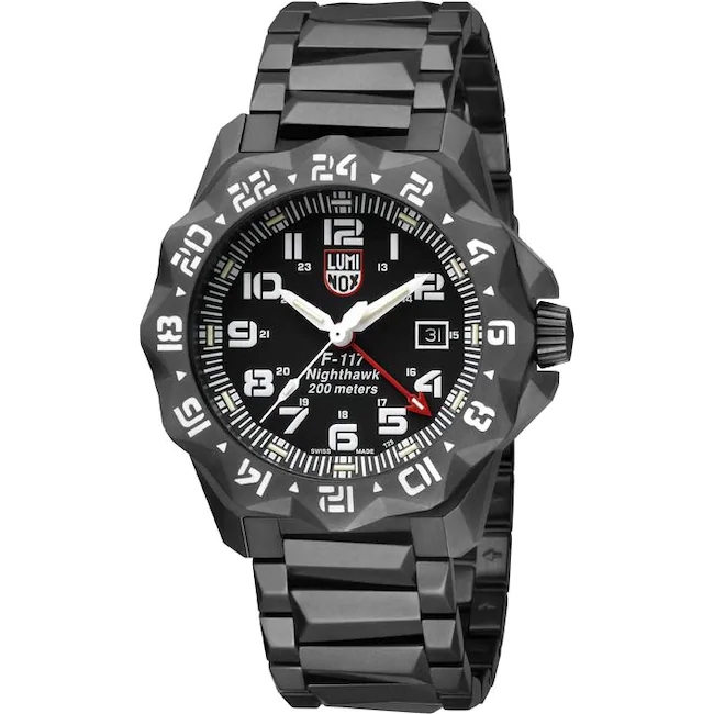 Die Luminox Herrenuhr F-117 Nighthawk™ 6400 Series. Sportliche, hervorragend verarbeitete Edelstahl Uhr mit Nachtsichteigenschaften, die speziell für die Piloten der F-117 Nighthawk™ entwickelt wurde. – Die F-117A Nighthawk ist ein zweistrahliges, einsitziges Flugzeug, das von Lockheed in den 1970er-Jahren für die US Air Force entwickelt und bis 1990 mit geringfügigen Modifikationen gefertigt wurde.