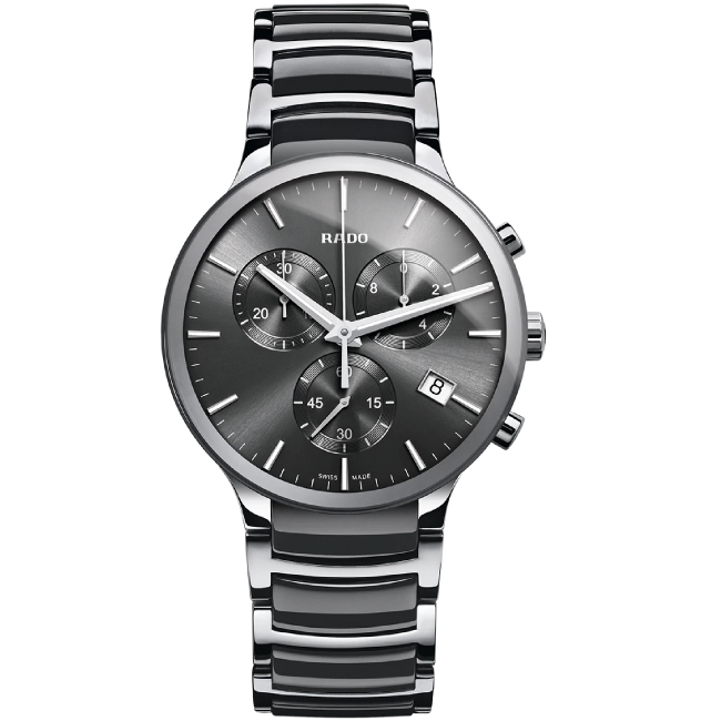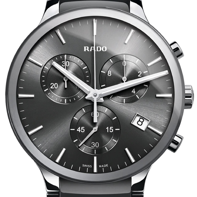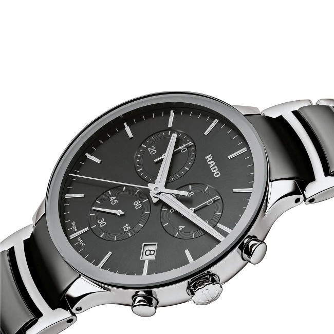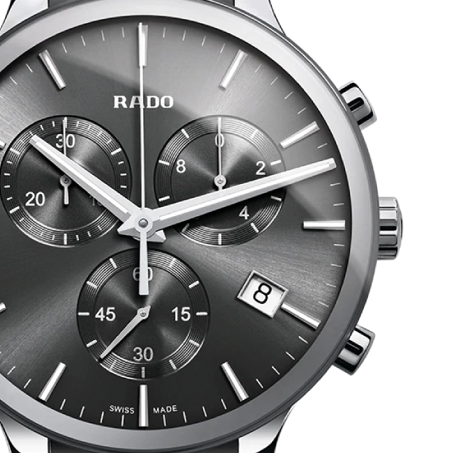 Die Zeit fliegt und fliegt, doch mit dieser Quarzchronographen-Edition der Rado Centrix können Sie sie präzise messen. Wenn jede Sekunde zählt, sollten Sie immer die Zeit auf eine Zehntelsekunde genau kennen. Diese Rado Centrix bietet Sportlichkeit und den unverkennbaren Rado Look in Kombination mit dem angenehm tragbaren Armband aus hochwertigem HighTech-Keramik und Edelstahl. Geschmeidige Linien und Oberflächen geben ihr einen raffinierten und gleichzeitig modernen Touch. So, wie sich die besten Modeschöpfer der Welt auf die perfekte Mischung aus Stoff und Schnitt verlassen, setzt diese Rado Centrix Chronograph auf eine Mischung aus eleganten Linien und dazu passenden Materialien.