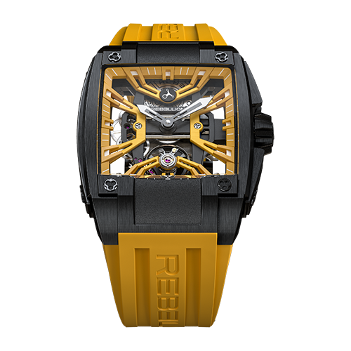 Description Technicality, lightness, and purity of design: the RE-volt refuses to compromise. A perfect incarnation of the very essence and philosophy of REBELLION. Smaller than existing models, its square shape and stylishly bold manufacture movement are beyond compare. Its sapphire crystal (transparent or slightly tinted) embodies watch styling aesthetics with full transparency, enhancing its skeletonized movement that continually brings to mind the technical and stylistic audacity of car chassis. Playing provocatively with shadow and light, Re-Volt knows how to stand out from the crowd thanks to its “in-house” calibre, muscular silhouette, high-tech nature, and exceptional performance with its 48-hour power reserve. Every detail expresses and embodies a passion for motorsport.