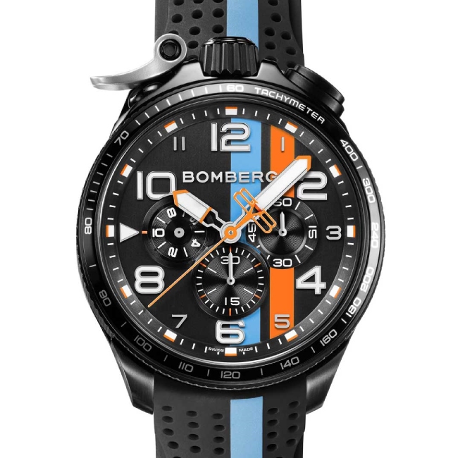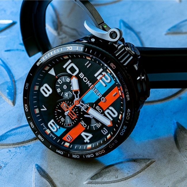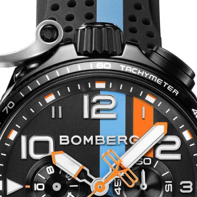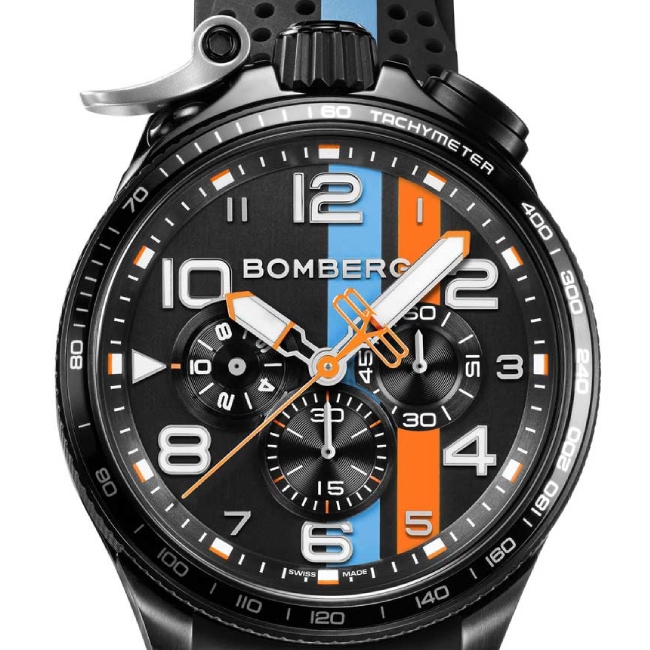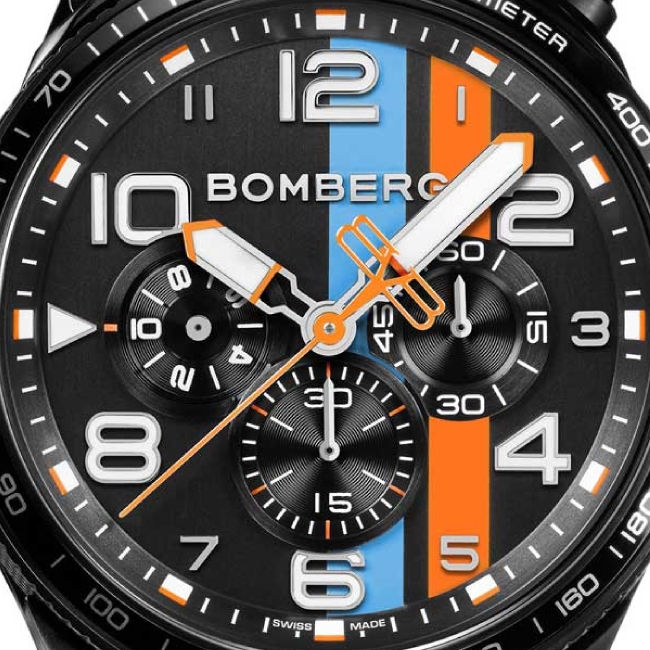 Dieser stylische Chronograph mit kühnem Design besticht durch die unverkennbaren Merkmale von BOMBERG in XL-Grösse: Krone bei 12 Uhr in der „Bullhead“-Position und farblich abgestimmter Drückerauslöser bei 11 Uhr. Dank eines Medaillons kann dieser Zeitmesser zur Taschenuhr mutieren, wobei eine zusätzlich angebotene Kette das hervorragend zum jeweiligen Gehäuse passende Armband ablöst.