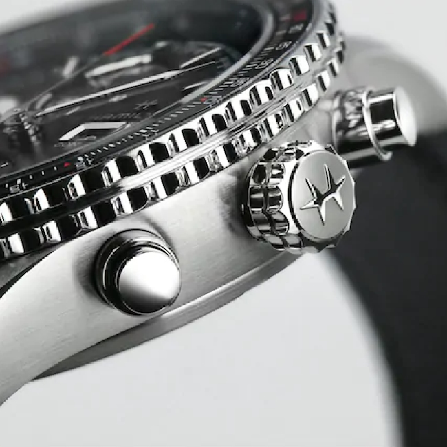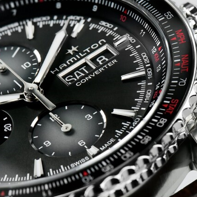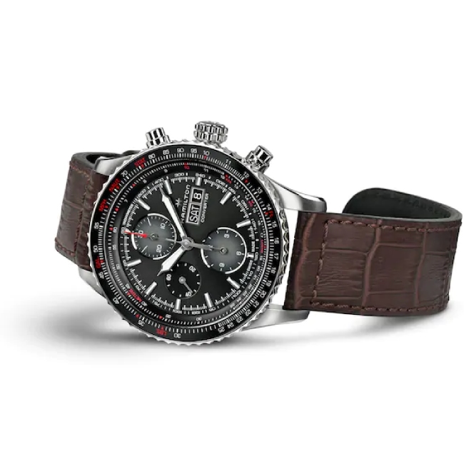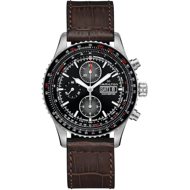 Fortschrittliche Technologie für den anspruchsvollen Piloten. Berechnen Sie wichtige Umrechnungen und Metriken mit nur einem Blick auf die beidseitig drehbare Rechenschieber-Lünette der Khaki Aviation Converter Auto Chrono. Dieses leistungsstarke Tool ermöglicht Umrechnungen wie von Fuss in Meter oder Meilen in Kilometer oder auch zwischen Währungen. Berücksichtigt man dann noch, dass das H-21-Si Automatikchronographenwerk mit einer hochwertigen, amagnetischen Spiralfeder aus Silizium ausgestattet ist, hat diese stilvolle Fliegeruhr mit 44mm Durchmesser wirklich alles, was Sie bei Ihrem nächsten Abenteuer in den Lüften brauchen.