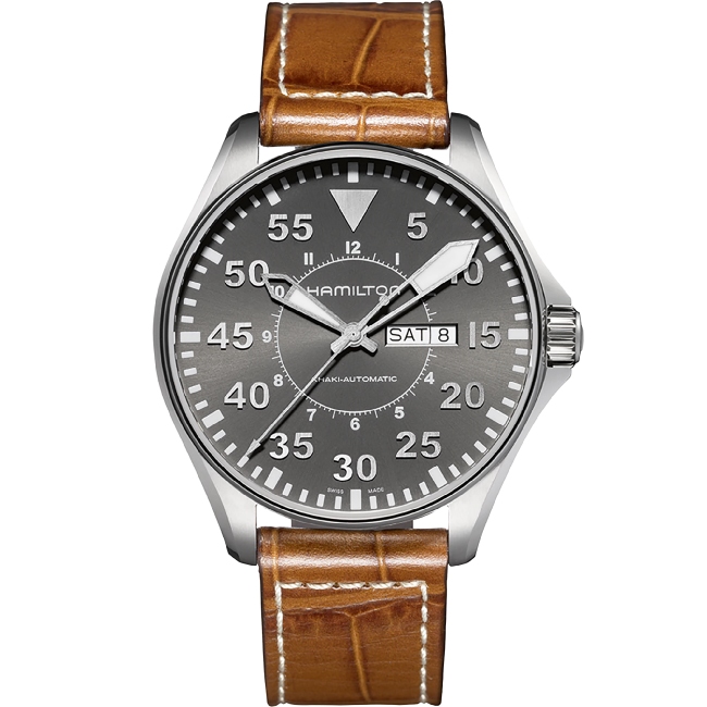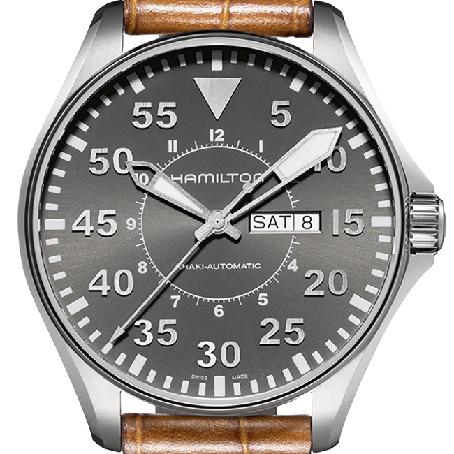 Mit der Khaki Pilot fühlt man sich wie ein amerikanischer Pilot aus der Pionierzeit der modernen Luftfahrt. Schon damals vertrauten die Piloten während ihren Expeditionen auf die Zuverlässigkeit der Hamilton Uhren. Die Khaki Pilot besticht durch ihr klassisches Fliegerdesign und das große, gut lesbare Zifferblatt mit Tages- und Datumsanzeige und Zeigern mit Superluminova-Beschichtung. Bei dieser Uhr stimmen Form und Funktion. Das perfekte Zeitinstrument für jeden Piloten.