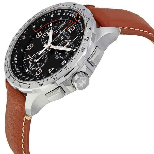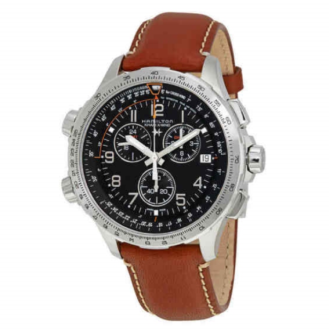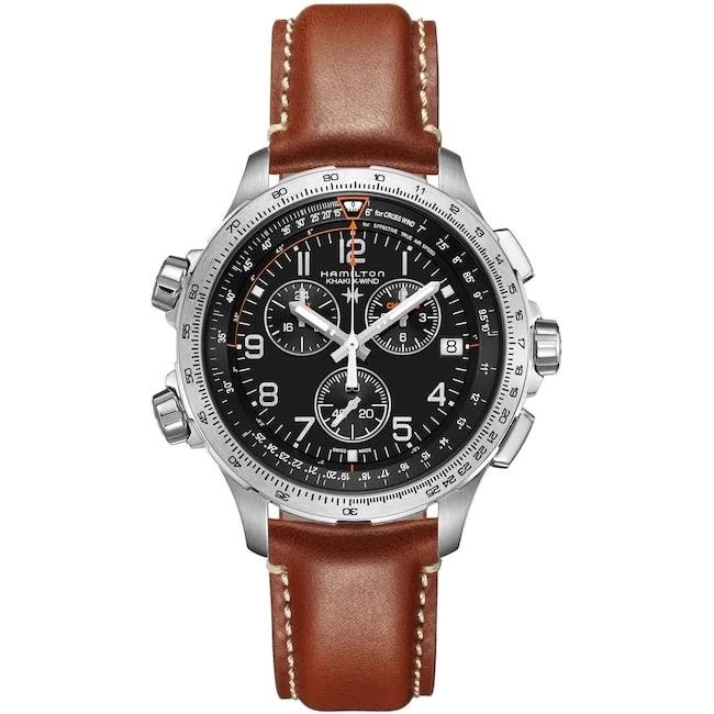 Ein neues Kaliber, das eine 24-Stunden-GMT-Anzeige mit einem Chronographen verbindet, bringt frischen Wind in die Linie Khaki X-Wind. Das robuste 46 mm-Edelstahlgehäuse weist eine verschraubte Krone und eine drehbare Lünette auf und bildet einen eindrucksvollen Rahmen für die Stunden- und Minutenzähler, die sich vom kräftig schwarzen Hintergrund des Zifferblatts abheben.