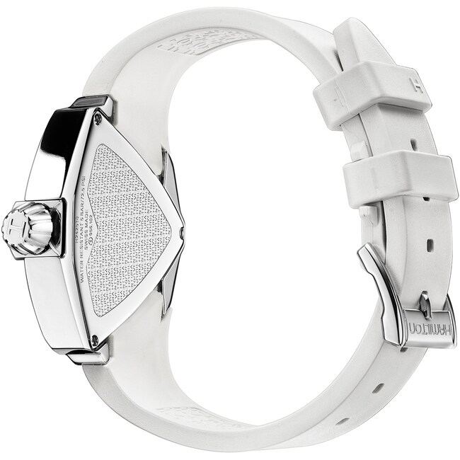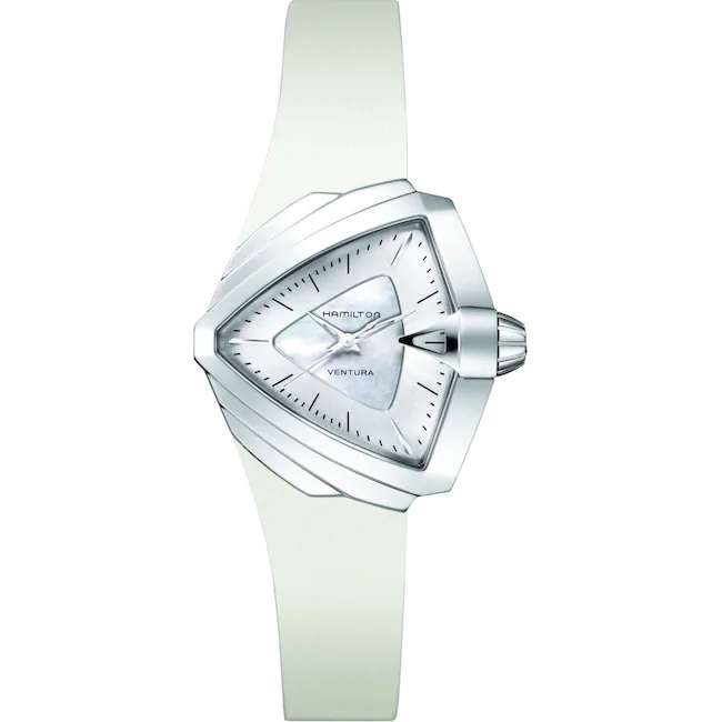 Auch mehr als ein halbes Jahrhundert nach ihrer Geburtsstunde macht die Hamilton Ventura in Form einer modernen Damenversion weiter von sich reden. Dem klassischen Grundkonzept verleihen unerwartete Nuancen ein topaktuelles futuristisches Äußeres. Das vertraute, schildförmige Edelstahlgehäuse erhält durch glatte Oberflächen eine markante zeitgemäße Optik. Die ins Gehäuse integrierte Krone läuft in einem Dreieck aus, dessen Spitze auf 3 Uhr zeigt. Das Zifferblatt in Weiß und Perlmutt verleiht der Uhr Rasanz. Passend zum ultramodernen Design geht das Gehäuse elegant in ein stylisches, weiches Kautschukarmband über.