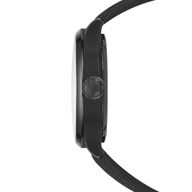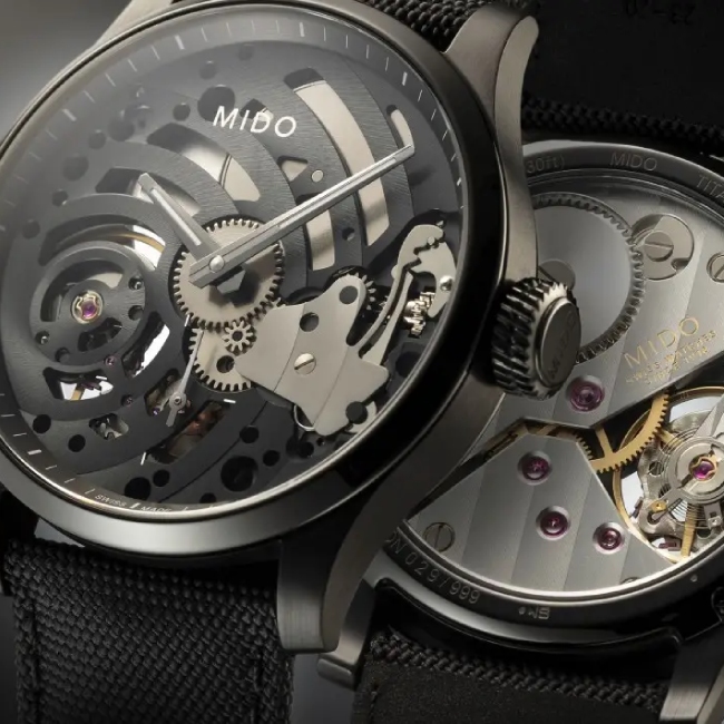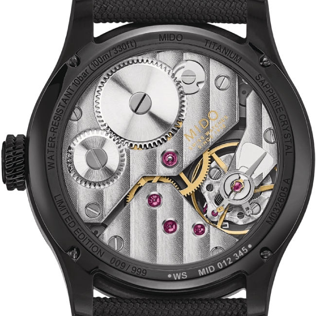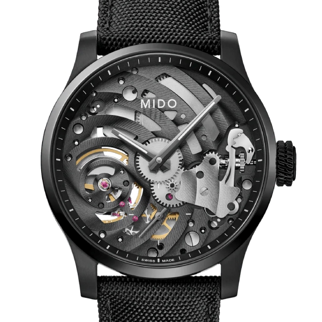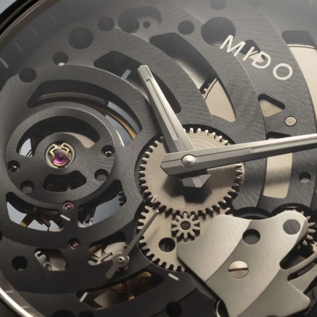 Die Multifort Mechanical Skeleton Limited Edition verfügt über ein Hightech-Titangehäuse mit schwarzer PVD-Behandlung und einem Durchmesser von 44 mm. Das Zifferblatt weicht einem skelettierten Uhrwerk mit einer schwarzen Platte, die mit Genfer Streifen verziert ist – die wahre DNA der Multifort-Kollektion. In dieser Premiere für Mido zeigt die Marke mutig das volle Ausmass ihrer Uhrenkompetenz. Diese seltene Serie ist auf 999 nummerierte Zeitmesser limitiert.