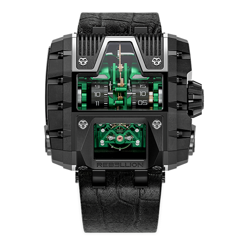 Description Strapping and muscular, the Gotham uninhibitedly parades its formidable power. On its stocky, titanium chassis*, the angular- shaped body protects an engine of exception, of which only the key elements are exposed. Boasting the same energy distribution system as the T-1000, the Gotham showcases the same mind-blowing power reserve of 1,000 hours. The patented winding system is driven by two micro-chains: 182 elements on 46mm. Special limited edition of 25 pieces. Personalization options available.