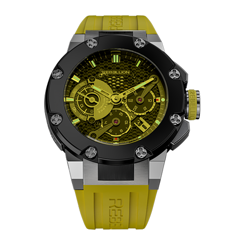 Description In collaboration with award-winning Eric Giroud, REBELLION Timepieces has conceived and developed the Predator in the same spirit as the rest of its collection: with authenticity, refined design and uncompromising quality and performance. A strapping combination of angles, layers and curves, the Predator Chrono offers a perfect blend of watchmaking and automobile aesthetics. Every detail of the design speaks of high performance racing mechanics. From the honeycomb dial to the bezel held by its REBELLION screws, down to the patented deployment buckle. Boasting a generous 48-hour power reserve and date indicator, this solid chronograph also stands out for tis original seconds’ indicator at 9 o’clock. A short small hand runs from 0 to 30 while a larger hand takes over from 30 to 60 seconds, with an automatic CONCEPTO-based movement.
