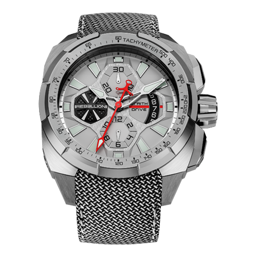 Description An intensely impressive motorsport-inspired chronograph, the Wraith Drive unashamedly asserts it ambitions for victory. Its very DNA is embodied within every detail. Member of the Rebellion racing team, the Wraith Drive is endowed with exemplary endurance: 48 hours of autonomy. Like every perfected driver, the Wraith Drive is able to adapt. Natural steel or black DLC finish chassis, six material/colour combinations and two strap options available in ultra-sports NyTech or elegant calf leather.