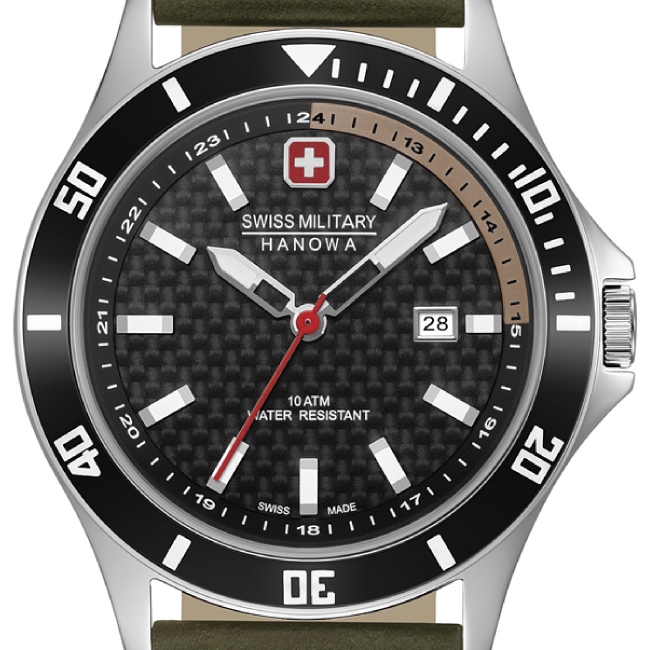 Die Flagship Racer von Swiss Military Hanowa überzeugt durch sein sportliches und unverkennbarem Design. Ein erstklassiges Schweizer Quarzwerk (Ronda 505) sorgt für eine präzise Zeitmessung. Ein hochwertiges Edelstahlgehäuse (Ø 42 mm) mit einem einzigartigen Zifferblatt-Design, beeindruckt durch seine unverkennbare Karbon-Struktur. Die farbige Lünette unterstreicht die Sportlichkeit der Flagship Racer.
