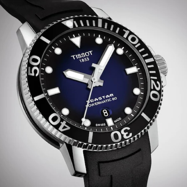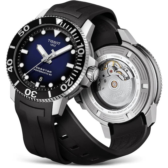 Die Tissot Seastar 1000 Automatic Uhr ist die perfekte Wahl für Taucher. Sie beeindruckt durch ihre Hochleistungsfähigkeit bis zu einem Druck von 30 bar (300 m / 1000 ft), lumineszierenden Zeigern und Indizes sowie der einseitig drehbaren Taucherlünette. Mit dieser Uhr können Sie sich mutig in die Tiefe wagen, sie wird Sie nicht fallenlassen. Diese Uhr der Seastar 1000 Automatic Kollektion ist mit einem Swiss Made Powermatic 80 Werk, kratzfestem Saphirglas, einem 316L – Edelstahlgehäuse sowie verschraubter Krone und verschraubtem Gehäuseboden ausgestattet.