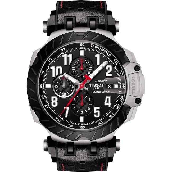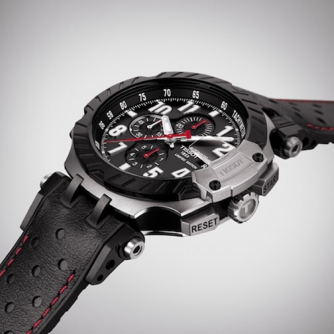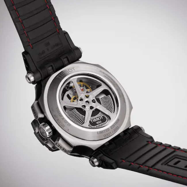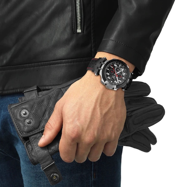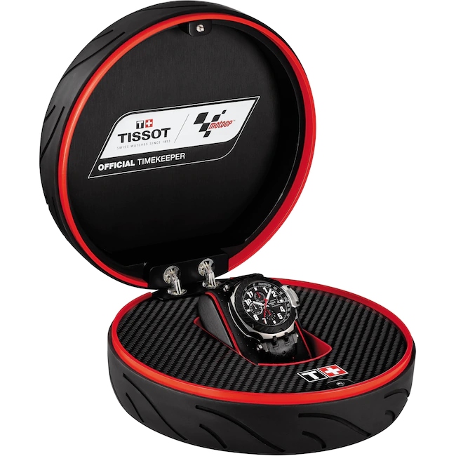 Tissot ist seit vielen Jahren offizieller Zeitnehmer des MotoGPTM und stolz darauf, die T-Race MotoGPTM 2020 Automatic Chronograph Limited Edition vorzustellen. Dieses Modell ist auf weltweit 3.333 Exemplare limitiert und damit ein echtes Sammlerstück. Dieser Automatik-Chronograph zeigt sich von den hochmodernen Rennmaschinen des MotoGPTM inspiriert. Stilelemente aus der Welt des Motorradrennsports, beispielsweise die an eine Bremsscheibe erinnernde Lünette haben Eingang in das Design gefunden. Das Gehäuse besteht aus 316L-Edelstahl mit schwarzer PVD-Beschichtung. Das perforierte Lederarmband mit kontrastierenden roten Ziernähten macht das Modell sportlicher als je zuvor. Das Zifferblatt selbst erhält durch aufgesetzte Indexe und Ziffern auf unterschiedlicher Höhe eine besondere Tiefe. Der Sichtboden der Tissot T-Race MotoGPTM 2020 Automatic Chronograph Limited Edition besticht mit seiner 5 Speichen-Optik, die die Räder der MotoGPTM-Rennmaschinen darstellt. Darüber hinaus erinnert das sportliche Zifferblatt dieser Uhr an Drehzahlmesser und Tachometer eines Rennmotorrads. Das schwarze Zifferblatt steht im Kontrast zu den roten und weissen Farbakzenten, die ebenso für einen starken Renncharakter der Uhr sorgen wie auch die Farben von Tissot wiedergeben. Im Inneren schlägt das zuverlässige C01 Chronographenwerk seinen gleichmässigen Takt und stellt Swiss Made Präzision und Zuverlässigkeit sicher, Das Armband im Rennfahrerstil aus perforiertem Leder sowie die Wasserdichtigkeit bis zu einem Druck von 10 bar (100 Metern/330 Fuss) geben dieser fantastischen Uhr den letzten Schliff.
