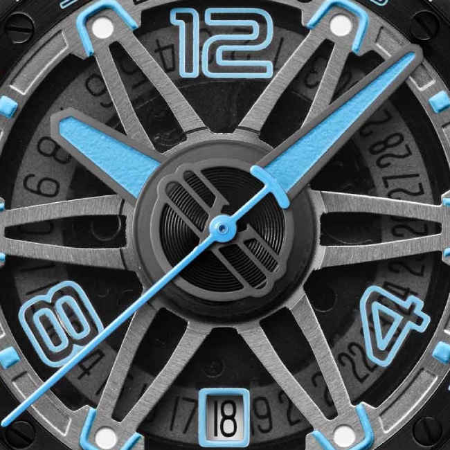 Der Charakter dieser Bomberg-Automatikuhr kommt von den eleganten pulverblauen Akzenten – auf den drei Zeigern, den Stunden- und Minutenziffern und dem Farbtupfer auf der Krone, der bei 2 Uhr liegt. Der Schlüssel zum Gesamtbild ist das blaue Silikonarmband im Rennstil, das perfekt zu den Zifferblattakzenten passt. Das Zifferblatt weist auch ein sechszackiges Muster auf, wie die Speichen eines Rades, das an die flüchtige Natur der Zeit erinnert – und an Ihre Lust, das Leben schnell anzugehen und nicht zu warten, bis die Küste klar ist. Die Seiten des Gehäuses sind mit einem eingekerbten « Granatenmuster » verziert, das daran erinnert, wie die besten – und am besten gemachten – Pläne immer noch explodieren können. Die Uhr ist ein Genuss, sie zu betrachten und zu tragen, und die zuverlässige Schweizer Technik im Inneren des Gehäuses sorgt für eine lange Lebensdauer.