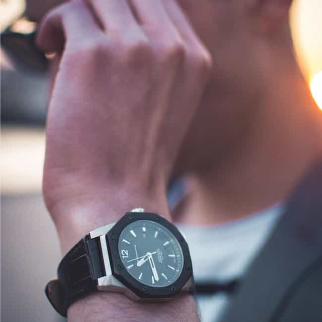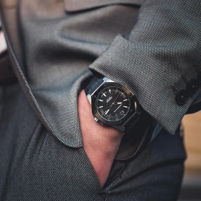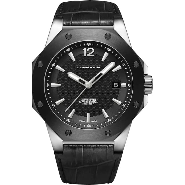 Das polierte Gehäuse dieser Cornavin hat einen Durchmesser von 41 mm und ist mit acht Schrauben auf der schwarz PVD-beschichteten, achteckigen Lünette verziert.