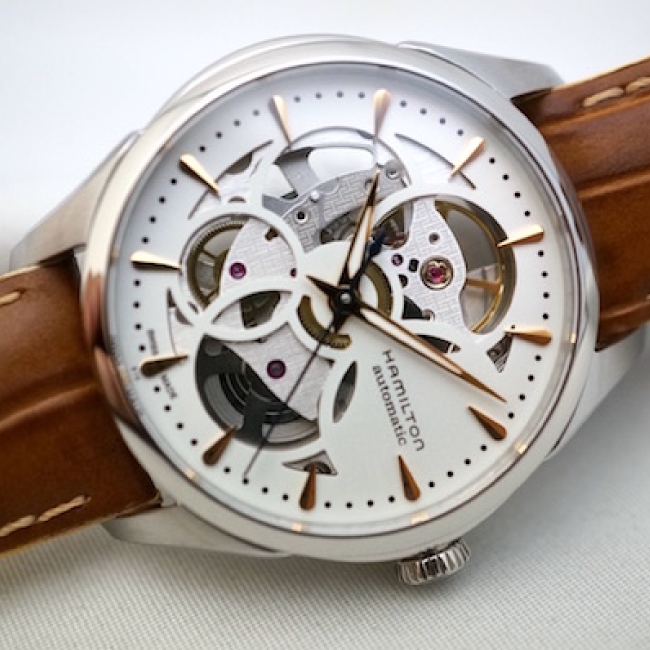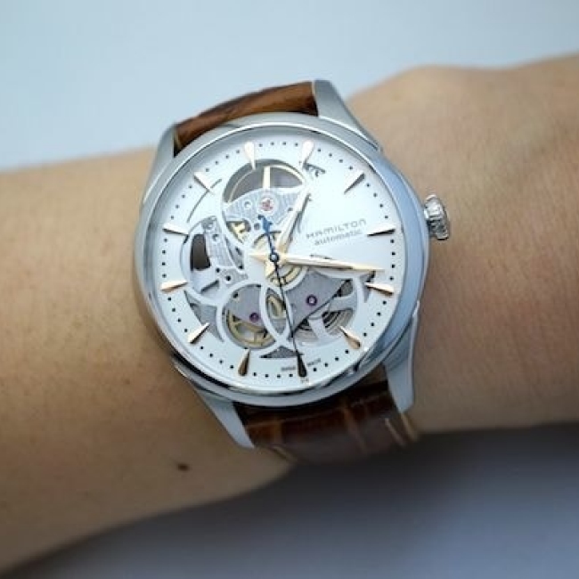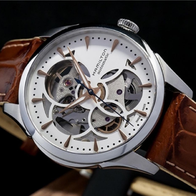 Die sanften Rundungen der Jazzmaster Skeleton Lady werden durch ein satiniertes und poliertes Gehäuse und ein durchbrochenes Zifferblatt mit diamantgeschnittenem abgeschrägten Rand unterstrichen. Trotz ihrer romantischen Anmutung ist die Jazzmaster Skeleton Lady erstaunlich robust und bis zu einem Druck von 5 Bar wasserdicht, sodass sie den Bedürfnissen aktiver Frauen im 21. Jahrhundert, derer sie sich sehr bewusst ist, gerecht wird. Das mit hochwertigen Finissierungen versehene neue Hamilton-Kaliber H-20-S sorgt für eine 42-stündige Gangreserve.