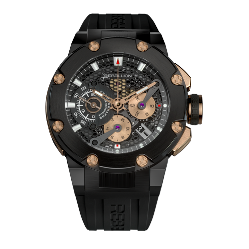 Description In collaboration with multi-award winner in watch design Eric Giroud, REBELLION Timepieces has conceived and developed the Predator in the same spirit as the rest of its collection: with authenticity, refined design and uncompromising quality and performance. A strapping combination of angles, layers and curves, the Predator Chrono offers a perfect blend of watchmaking and automobile aesthetics. For this special and limited edition in Black DLC-treated titanium, every detail of the design speaks of high performance racing mechanics. From the honeycomb dial to the bezel held by its REBELLION screws colored in 5N, down to the patented deployment buckle. Boasting a generous 48-hour power reserve and date indicator, this solid chronograph also stands out for tis original seconds’ indicator at 9 o’clock. A short small hand runs from 0 to 30 while a larger hand takes over from 31 to 60 seconds, with a swiss automatic movement. Several personalization options available.