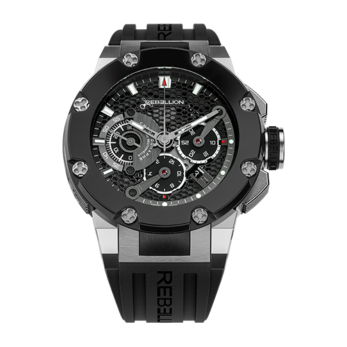 Description In collaboration with award-winning Eric Giroud, REBELLION Timepieces has conceived and developed the Predator in the same spirit as the rest of its collection: with authenticity, refined design and uncompromising quality and performance. A strapping combination of angles, layers and curves, the Predator Chrono offers a perfect blend of watchmaking and automobile aesthetics. Every detail of the design speaks of high performance racing mechanics. From the honeycomb dial to the bezel held by its REBELLION screws, down to the patented deployment buckle. Boasting a generous 48-hour power reserve and date indicator, this solid chronograph also stands out for tis original seconds’ indicator at 9 o’clock. A short small hand runs from 0 to 30 while a larger hand takes over from 30 to 60 seconds, with an automatic CONCEPTO-based movement.
