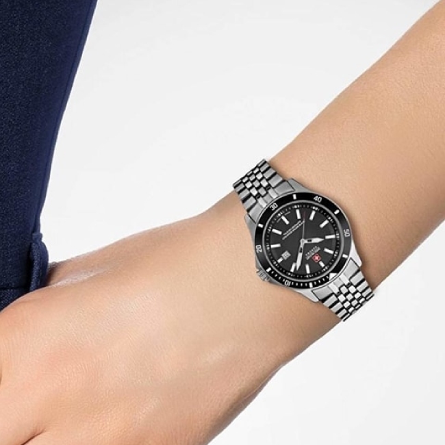 Die Swiss Military Hanowa Flagship Lady zeigt sich in einem raffinierten und sportlichen Kleid, besticht durch Präzision, Robustheit und ist bis zu einem Druck von 10 bar (100 m) wasserdicht. Mit ihrer Sportlichkeit wird sie viele Blicke auf sich ziehen. Zuverlässige Funktionen runden ihre aufregende Erscheinung ab. Das Gehäuse ist aus hochwertigem, massivem Edelstahl hergestellt und hat eine mattierte Oberfläche. Zudem verfügt die Uhr über ein kratzfestes Saphirglas. Bühne frei für stilvolle Auftritte!